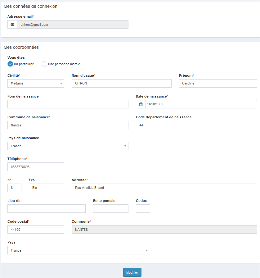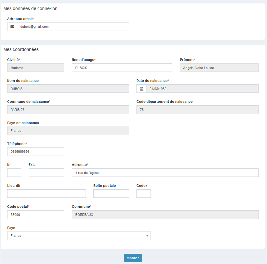 Exemple : Modification d'un compte (authentification par FranceConnect)