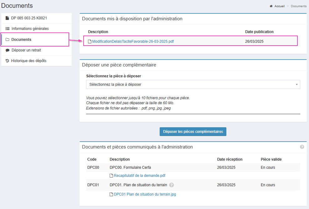 Retrouvez la liste des derniers documents mis à disposition par l'administration directement en page d'accueil via la section Mes Correspondances\Documents mis à disposition par l'administration.