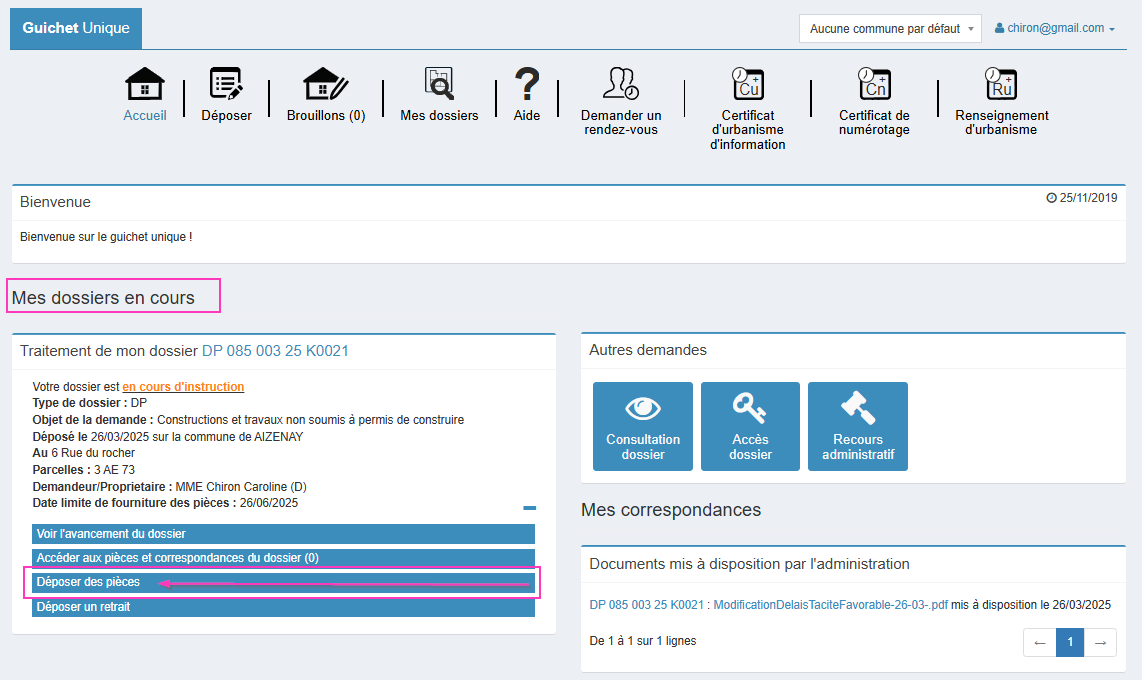 Dans le cas où vous souhaitez ajouter des pièces complémentaires à votre demande en cours d'instruction, utilisez la fonction [Déposer des pièces] depuis la vignette du dossier (ou le menu Documents). |